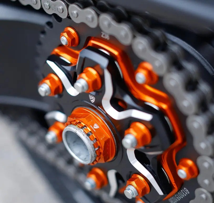 Rear wheel nut (left side) made from lightweight alloy, machined from a solid piece, and anodized for durability.