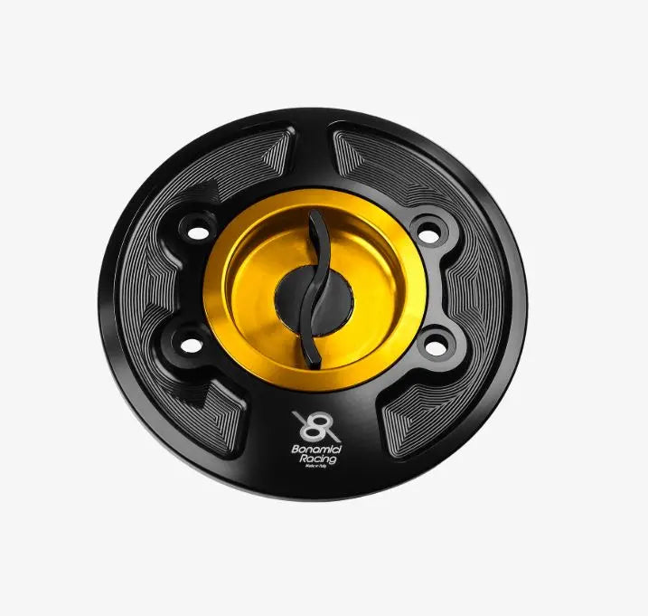 Bonamici BMW Gas Cap. Keyless for a Quick Release to make Gas Fill Ups Easy especially for Racers and Performance Street Riders. Up to 50% Lighter than OEM gas caps, made from CNC Aluminum T-6061. Anodized in Black. Includes Rubber Seal O-Ring and Stainless Steel Screws (may require use of OEM screws).