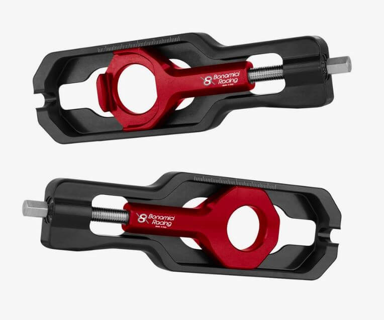 Bonamici Chain Adjuster for 17-25 Suzuki GSX-R 1000, 21-25 GSX-S 1000 produced from T-6061 Aluminum Alloy. If your chain is tight it will be rough and cause excess wear on sprockets, bearings, and even the counter-shaft seal and it can also cause premature stretching and weakening of the chain. On the contrary, if your chain is loose it could hit the frame, cause a jerky throttle response, or worse even fall off!
